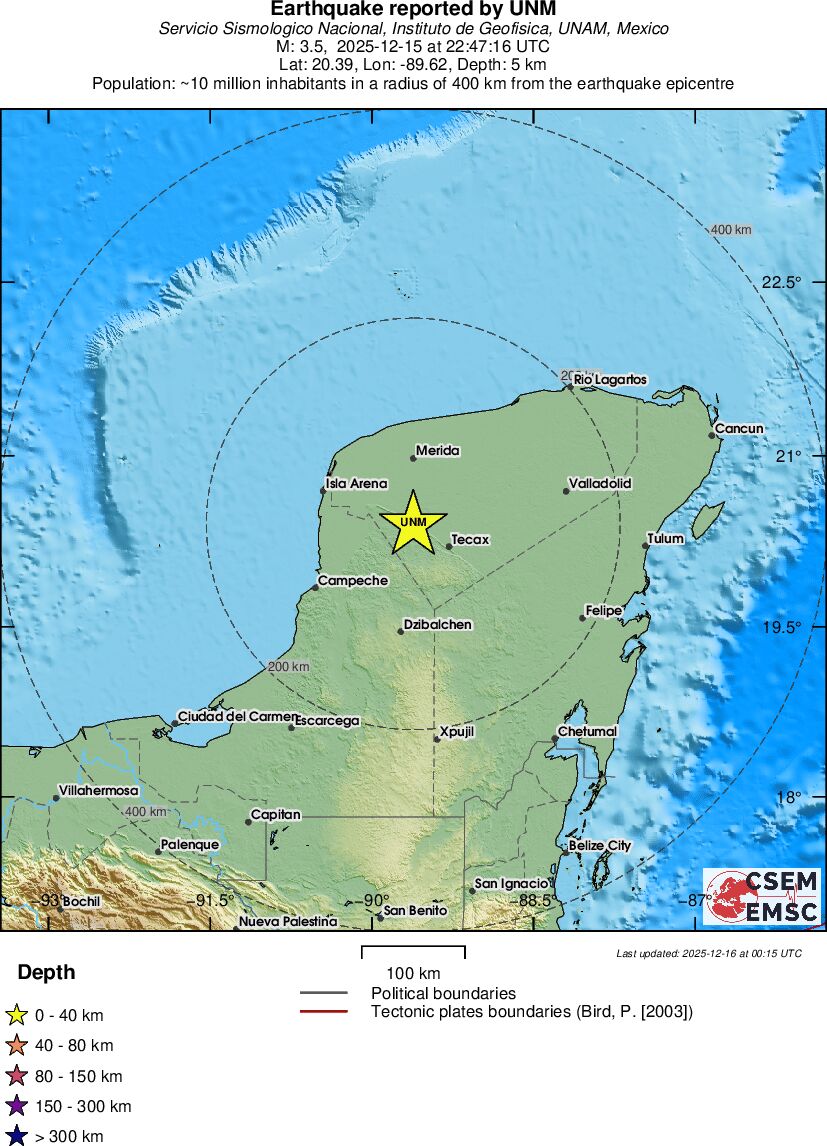 | 3.5 | 5 | 8539 | 23:47 | Link | Kleine beving - YUCATAN, MEXICO - Gisteren |